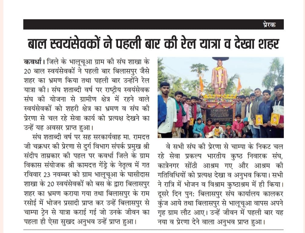 विगत दिनों कवर्धा जिले के भालूचुआ स्थित संत गुरु घासीदास शाखा के बाल स्वयंसेवकों ने अपनी संस्था भारतीय कुष्ठ निवारक संघ कात्रे नगर चापा परिसर का भ्रमण किया। इस अवसर पर उन्होंने संस्था द्वारा संचालित विभिन्न सेवा प्रकल्पों और गतिविधियों को नज़दीक से देखा। अपने छत्तीसगढ़ प्रान्त की मासिक पत्रिका "शाश्वत राष्ट्रबोध" के इस दिसम्बर माह के अंक में इस यात्रा का उल्लेख प्रमुखता से किया गया |