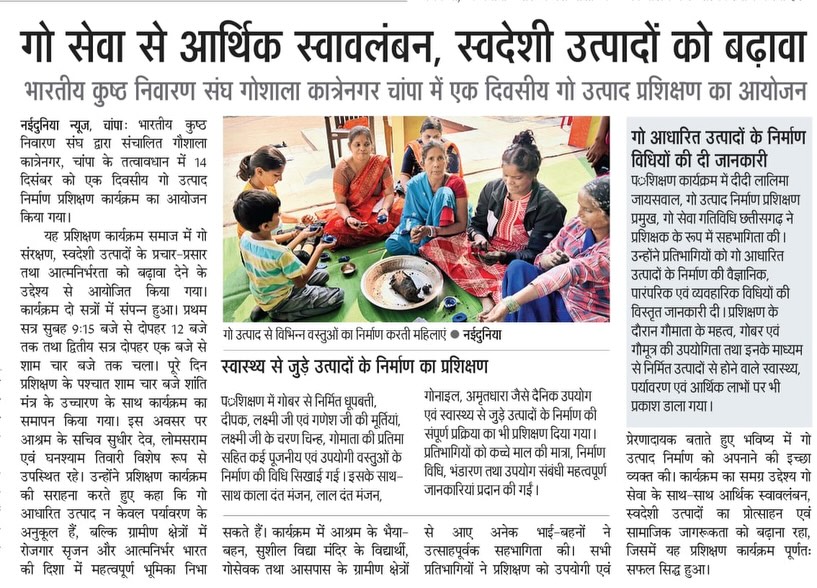 भारतीय कुष्ठ निवारक संघ, कात्रे नगर में एक दिवसीय गौ‑उत्पाद निर्माण एवं प्रशिक्षण कार्यक्रम आयोजित किया गया । उक्त प्रशिक्षण कार्यक्रम में दीदी लालिमा ने गोबर‑गौमूत्र से बनने वाले धूप‑बत्ती, दीपक, लक्ष्मी‑गणेश प्रतिमा, काला‑लाल दंत‑मंजन, अमृत धारा आदि के व्यावहारिक व विस्तृत प्रशिक्षण को साझा किया। कार्यक्रम में संस्था प्रमुख श्री सुधीर देव तथा श्री लोमसराम जी की गरिमामय उपस्थिति रही, जबकि आश्रम के कार्यकर्ता, विद्यार्थी गण तथा गौ‑सेवकों ने उत्साहपूर्वक भागीदारी की।