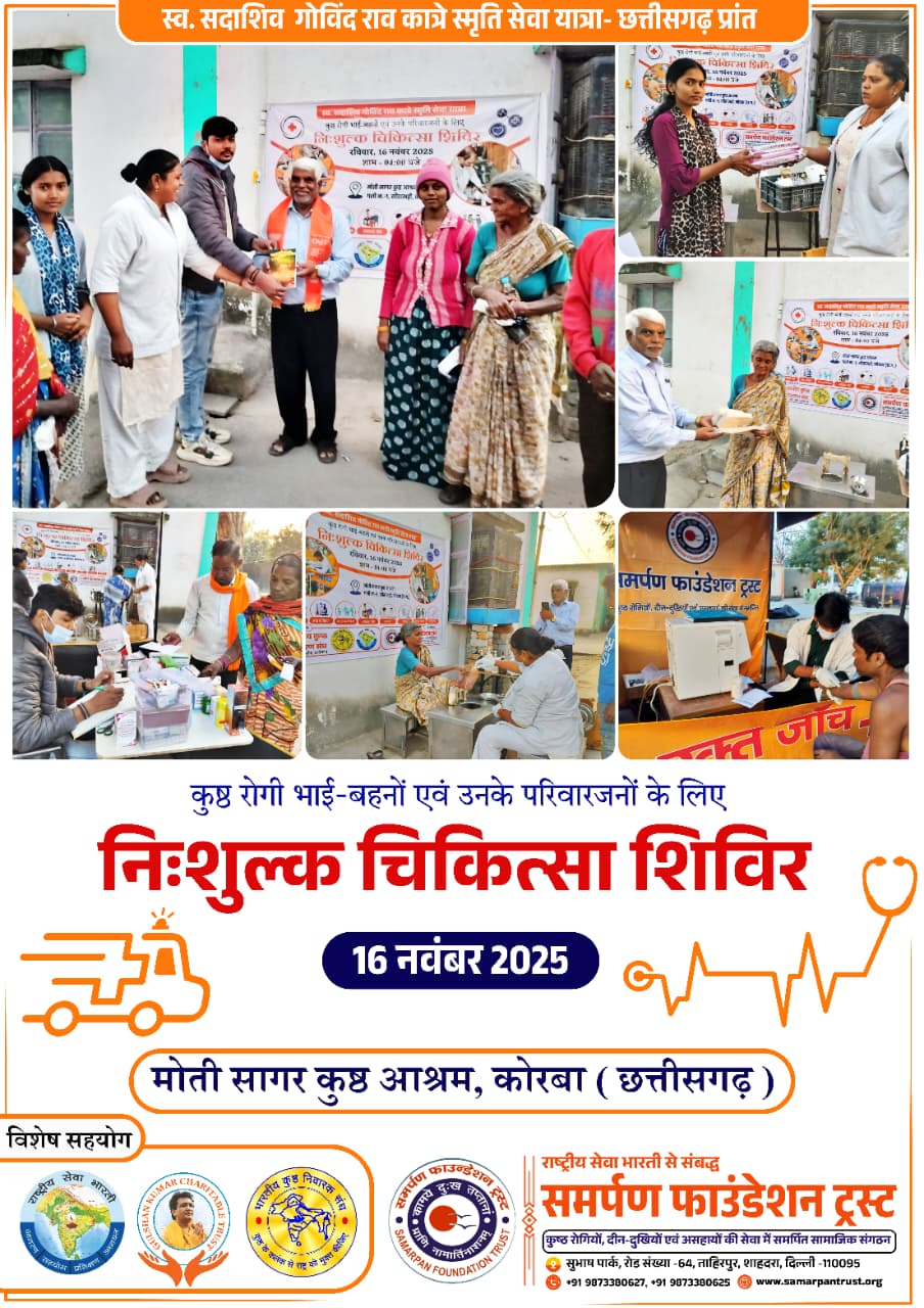 समर्पण चल चिकित्सालय सेवा के माध्यम से कुष्ठ बस्तियों में निःशुल्क चिकित्सा शिविरों का आयोजन आज समर्पण फाउंडेशन ट्रस्ट द्वारा राष्ट्रीय सेवा भारती एवं गुलशन कुमार चैरिटेबल ट्रस्ट के सहयोग से संचालित समर्पण चल चिकित्सालय सेवा के अंतर्गत छत्तीसगढ़ प्रांत की सभी कुष्ठ बस्तियों में निःशुल्क चिकित्सा शिविरों के आयोजन के उद्देश्य से "सदाशिव गोविंद राव कात्रे स्मृति सेवा यात्रा" का कोरबा से शुभारंभ किया गया। इस सेवा यात्रा के अंतर्गत 30 कुष्ठ बस्तियों में कुल 22 निःशुल्क चिकित्सा शिविर आयोजित किए जाएंगे। यह सेवा यात्रा 28 नवंबर 2025 को राजनांदगांव में सम्पन्न होगी। यात्रा का प्रथम चिकित्सा शिविर कोरबा स्थित मोती सागर कुष्ठ आश्रम में आयोजित किया गया। शिविर का शुभारंभ सेवा भारती के छात्रावास प्रमुख श्री मेघराज जी द्वारा किया गया। इस अवसर पर समर्पण सेवा दल के सदस्यों द्वारा उनका स्वागत किया गया तथा संगठन के सेवा कार्यों एवं चल चिकित्सालय पहल की जानकारी प्रदान करते हुए कुष्ठ बस्ती का भ्रमण भी कराया गया। श्री मेघराज जी ने सेवा कार्य में संलग्न कार्यकर्ताओं का उत्साहवर्धन किया। शिविर में निम्न स्वास्थ्य सेवाएं निःशुल्क प्रदान की गईं: * रक्तचाप (Blood Pressure) जाँच * रक्त शर्करा (Random Blood Sugar) जाँच * विभिन्न प्रकार की रक्त जाँच * चिकित्सकीय परामर्श एवं आवश्यकतानुसार दवाओं-इंजेक्शन का वितरण * महिलाओं हेतु सेनेटरी पैड वितरण * कुष्ठ रोगियों के घावों के लिए अल्सर प्रबंधन: साफ-सफाई, मरहम-पट्टी एवं लघु शल्य-चिकित्सा * चिकित्सीय दल में निम्न सदस्य उपस्थित रहे: प्रकल्प निदेशिका सुश्री संतोष रानी, डॉ. देव उत्कर्ष, अंकित, रोहित, दीपेन्द्र एवं किशन कुमार यह उल्लेखनीय है कि समर्पण चल चिकित्सालय सेवा वर्तमान में 10 प्रदेशों की 245 कुष्ठ बस्तियों में निवास करने वाले 1 लाख से अधिक परिवारों को नियमित अंतराल पर निःशुल्क चिकित्सा सेवाएं उपलब्ध करा रही है, जिससे कुष्ठ प्रभावित परिवारों को इलाज, सम्मान एवं स्वास्थ्य सुरक्षा सुनिश्चित हो रही है। समर्पण फाउंडेशन ट्रस्ट छुआछूत और सामाजिक भेदभाव का सामना कर रहे कुष्ठ प्रभावित परिवारों को स्वास्थ्य, शिक्षा एवं पुनर्वास के माध्यम से मुख्यधारा से जोड़ने के लिए निरंतर प्रयासरत है।